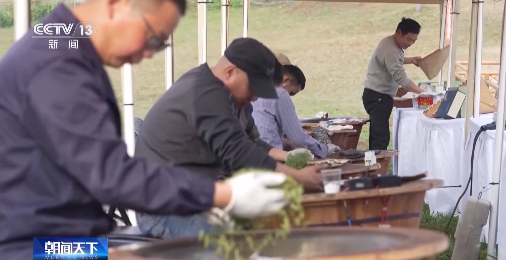 松阳茶叶加工户 董俊:一天销量基本上都在四五百斤以上。早上青叶收回家,晚上加工,然后第二天早上拿过来到市场上卖。茶叶品质不错,原料比去年的还好一点,口感、香味都比较好。