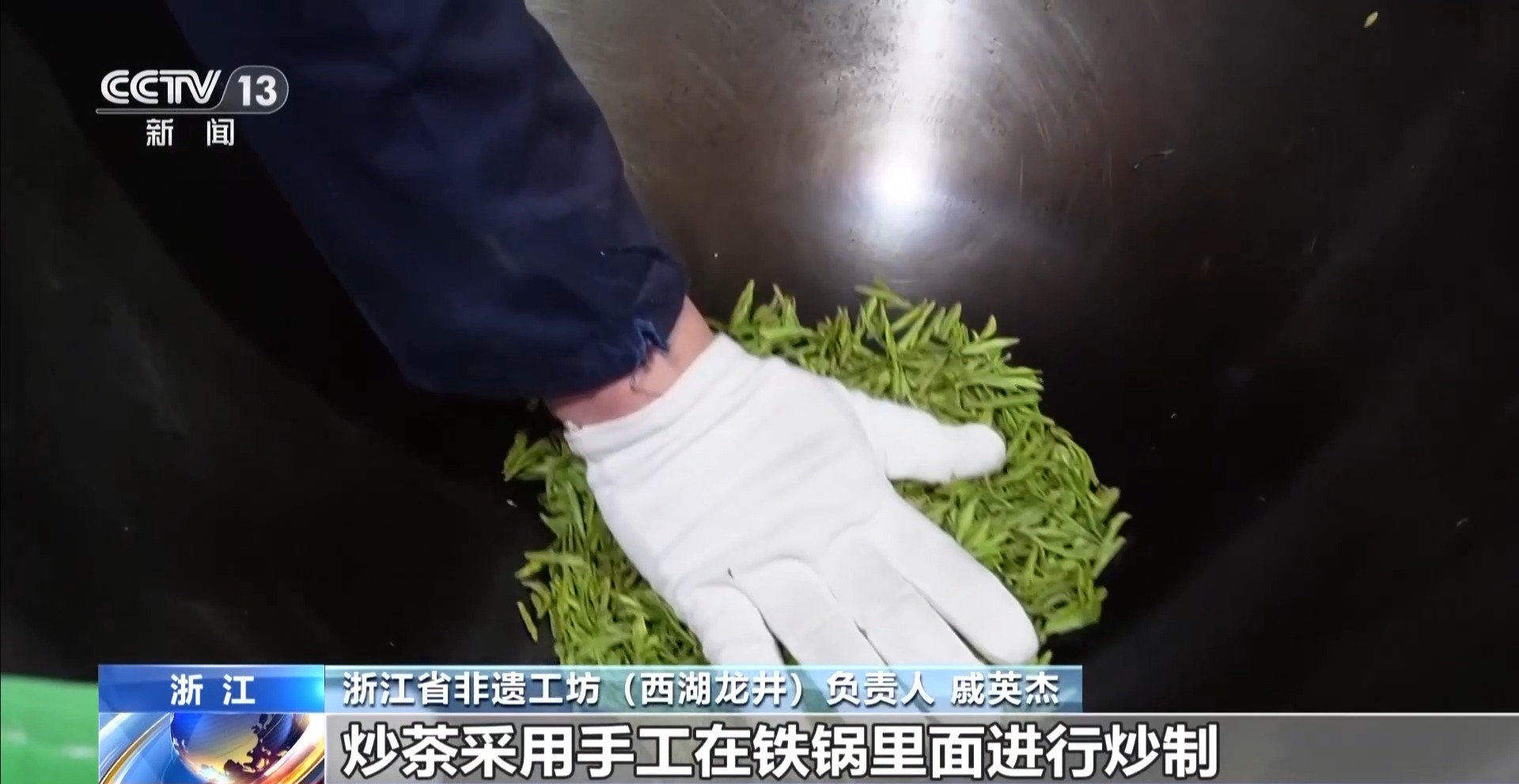 浙江省非遗工坊(西湖龙井)负责人 戚英杰:炒茶采用手工在铁锅里面进行炒制。锅温非常高,有200多摄氏度,是我们千百年来龙井制茶人一代代改进、改良的,把它传承下来的工艺。
