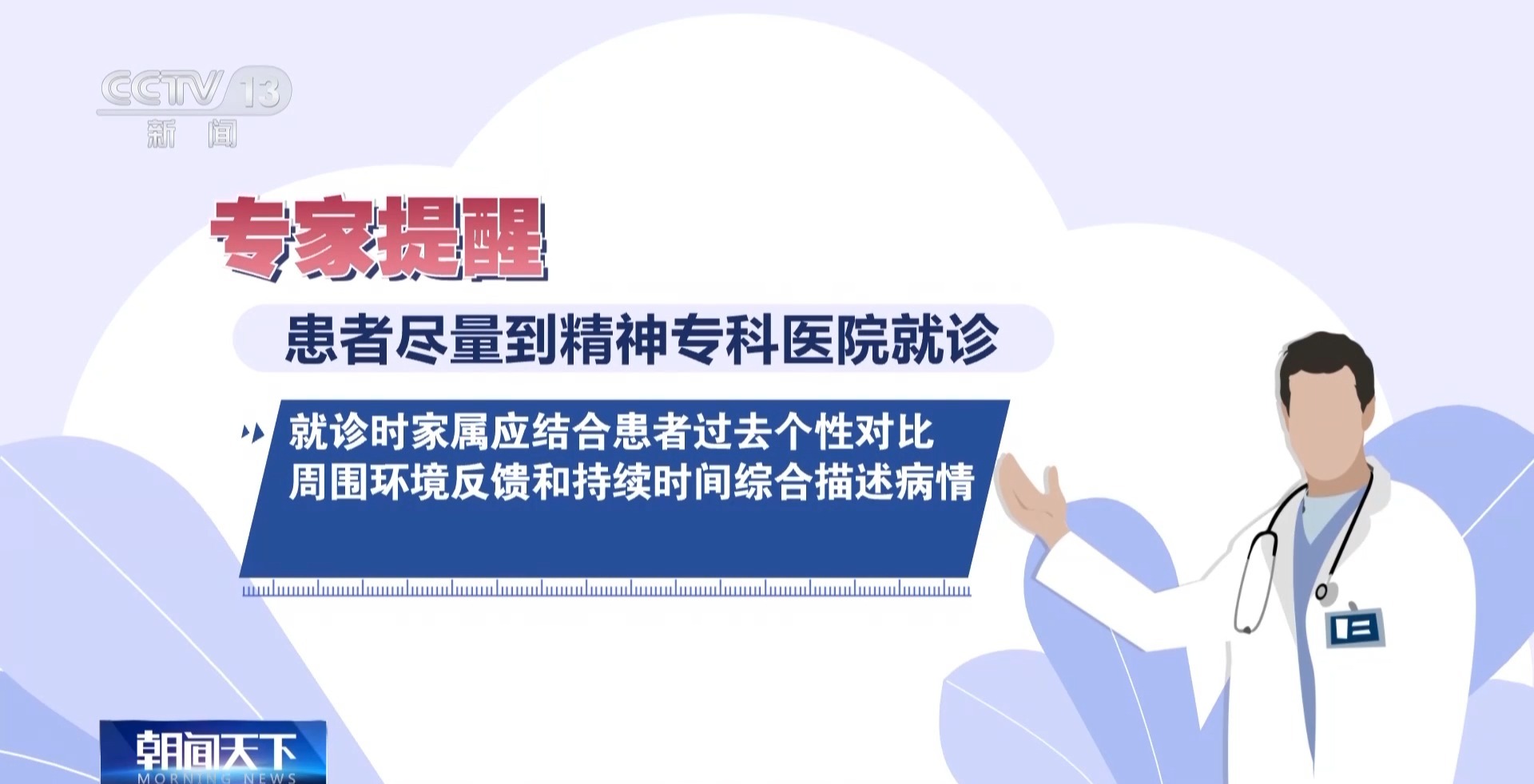 专家提醒,患者尽量到精神专科医院就诊,就诊时家属应结合患者过去个性对比、周围环境反馈和持续时间综合描述病情,协助医生准确判断病情。