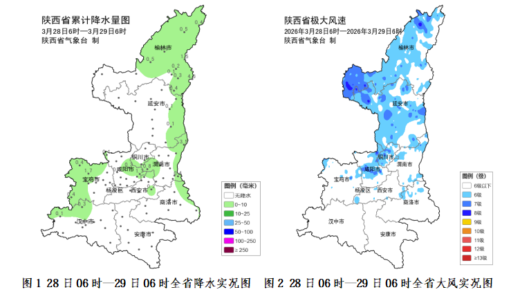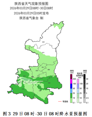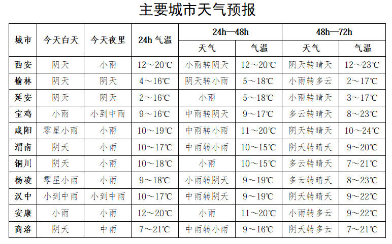 30日:全省阴天,陕北小雨(0~5毫米),关中、陕南小到中雨(2~25毫米),宝鸡西部局地、秦岭西段有雨夹雪或小到中雪(0~5毫米)。陕北西部及北部局地有霜冻。
