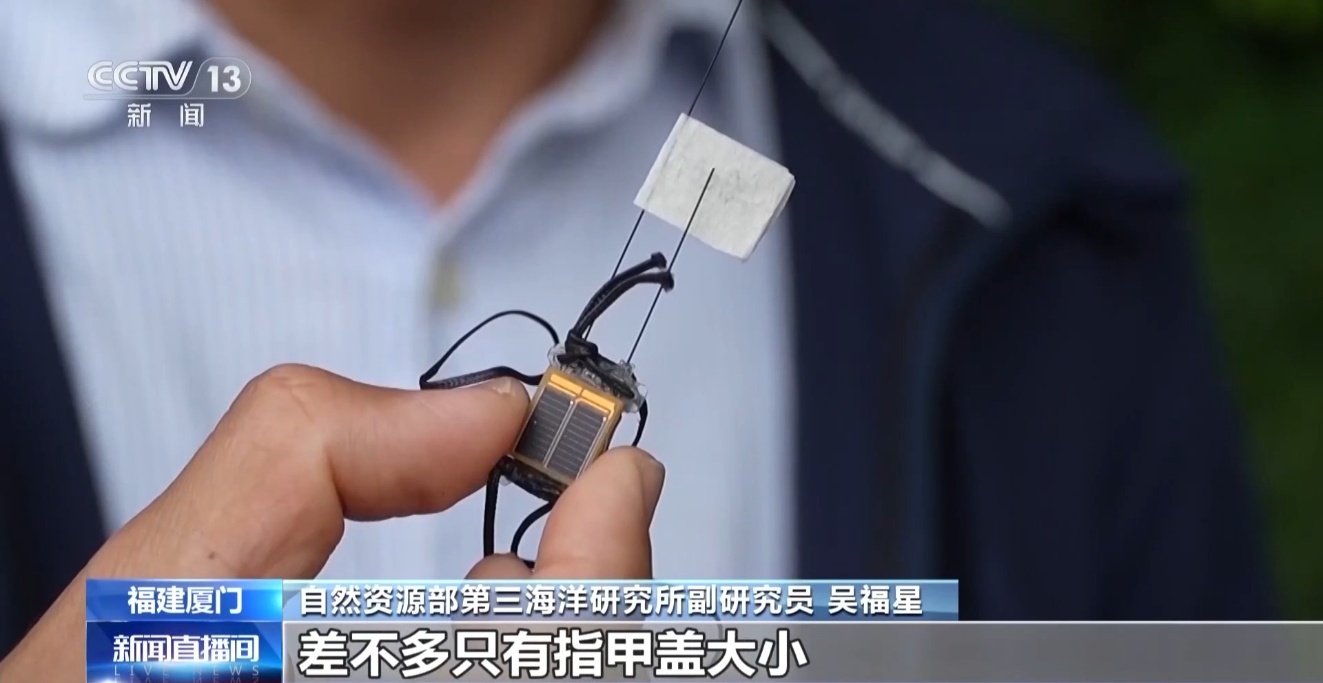 自然资源部第三海洋研究所副研究员 吴福星:随着设备不断更新,这个只有1.3克的设备差不多只有指甲盖大小。设备内置太阳能板,它能及时通过太阳进行充电。