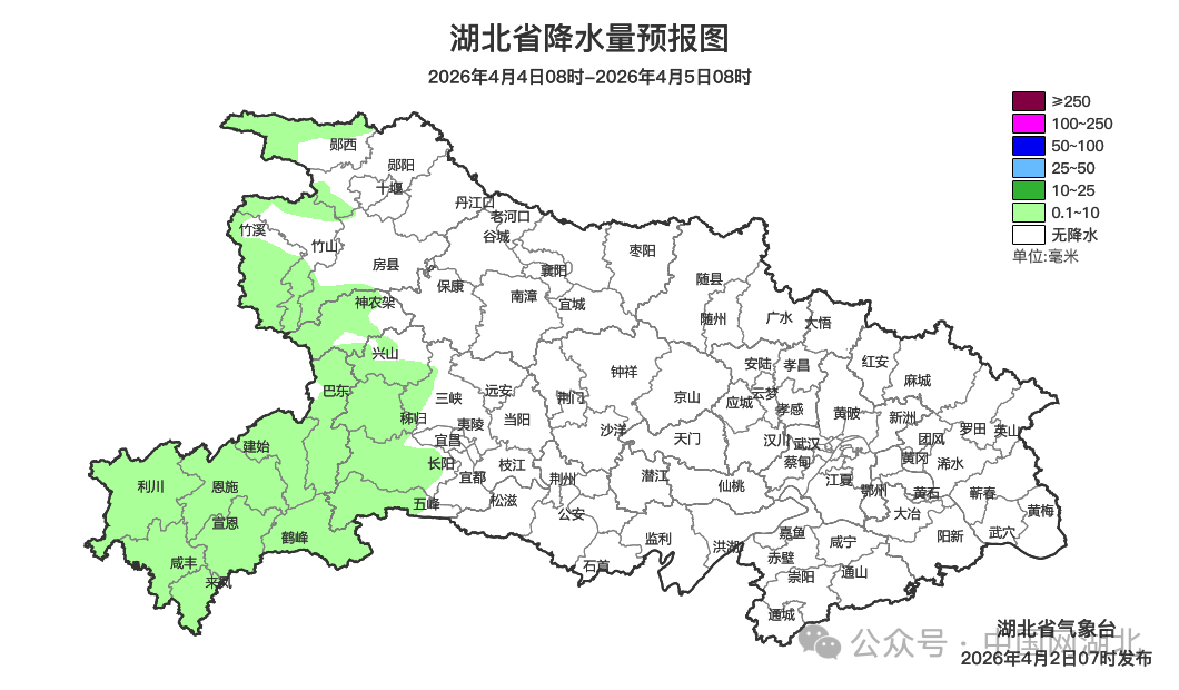 4月4日08时-5日08时,鄂西北西部、鄂西南多云转小雨;其他地区晴天到多云。最高气温22~28℃,最低气温北部8~12℃、南部12~15℃,偏北风转偏南风2到3级。