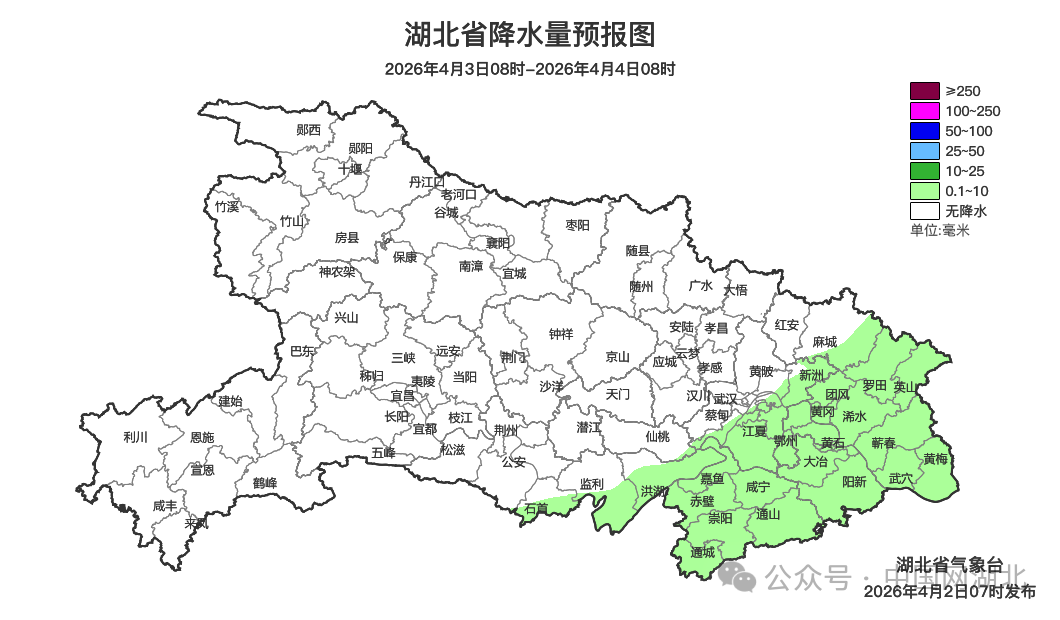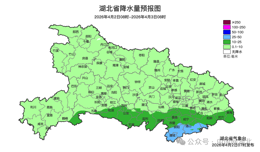 4月2日08时-3日08时,鄂西南、江汉平原南部、鄂东南阴天有小到中雨,局地大雨并伴有雷电;其他地区多云转小雨。夜间到早晨省内局地有雾。最高气温鄂东北21~24℃、其他地区16~21℃,最低气温10~15℃,偏东风转偏北风2到3级。