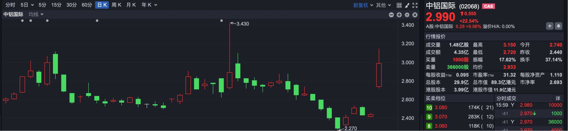 焦点板块方面,铝业股全天领涨市场。其中,中铝国际(HK02068)涨超22%,中国铝业(HK02600)涨超7%,中国宏桥(HK01378)涨超3%。