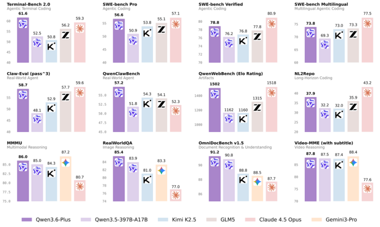 相较于上一代模型,千问3.6整体性能提升明显,尤其是编程Coding能力、智能体Agent能力和工具调用能力都实现了全面跃升。在SWE-bench系列真实编程任务测试、考察终端编程的Terminal-Bench2.0、长程编程任务NL2Repo,以及Claw-Eval、QwenClawBench等真实世界Agent能力评测中,Qwen3.6-Plus表现可完全匹敌Claude Opus 4.5,并显著超越了2倍乃至3倍其参数的GLM-5、Kimi-K2.5等国产模型。