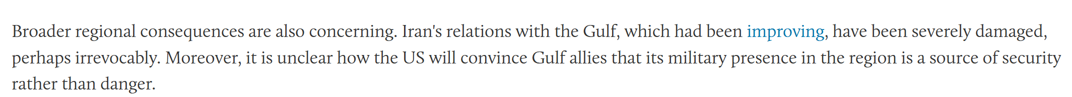 文章称,战争已经造成了深远的损害——成千上万人伤亡、基础设施广泛受损、经济危机加深等等——但一场旷日持久的战争将造成更大的后果。海湾国家已经被波及,复苏之路漫长。专家指出,战争结束后,更广泛的地区后果也令人担忧。伊朗与海湾国家本已改善的关系遭到严重破坏,或许无法挽回。此外,目前尚不清楚美国将如何说服海湾盟友其在地区的军事存在是安全的保障而非危险。