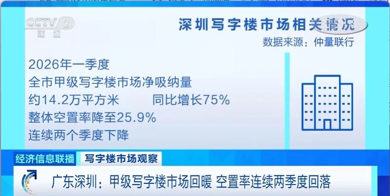 数据显示,深圳写字楼市场延续了自去年四季度以来的活跃态势,回暖信号持续增强。2026年一季度,全市甲级写字楼市场净吸纳量约14.2万平方米,同比增长75%;整体空置率降至25.9%,连续两个季度下降。