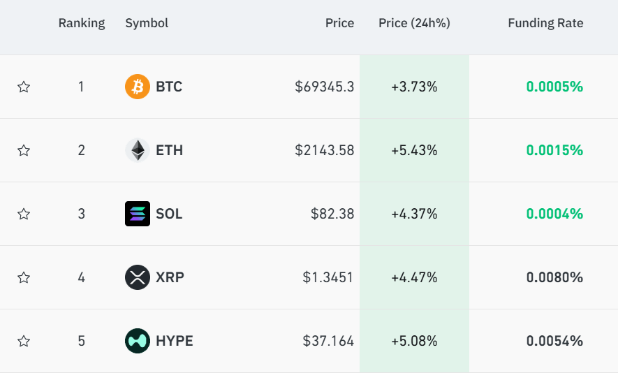 虚拟货币上涨,截至发稿,比特币上涨3.73%,报69345.3美元。