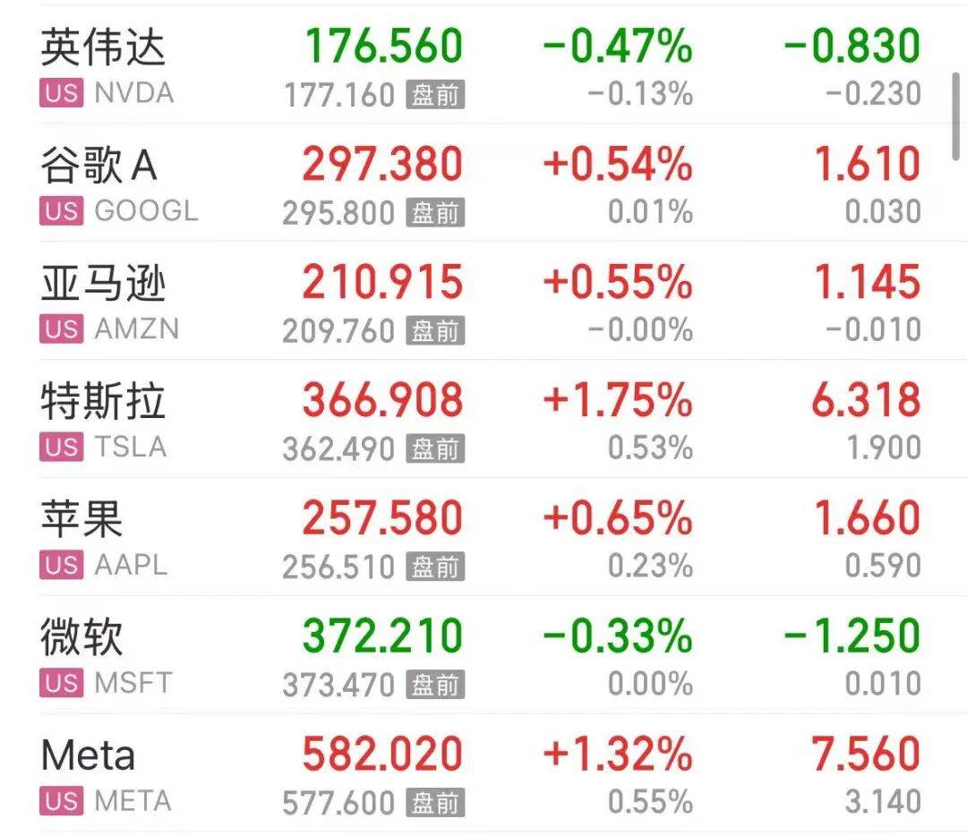 大型科技股涨跌不一,截至发稿,特斯拉、Meta涨超1%,谷歌、亚马逊、苹果微涨,英伟达、微软下跌。