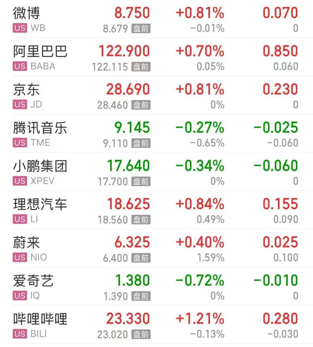热门中概股涨跌不一,哔哩哔哩涨超1%,阿里巴巴、京东、蔚来、理想汽车、微博微涨,小鹏汽车、爱奇艺、腾讯音乐下跌。