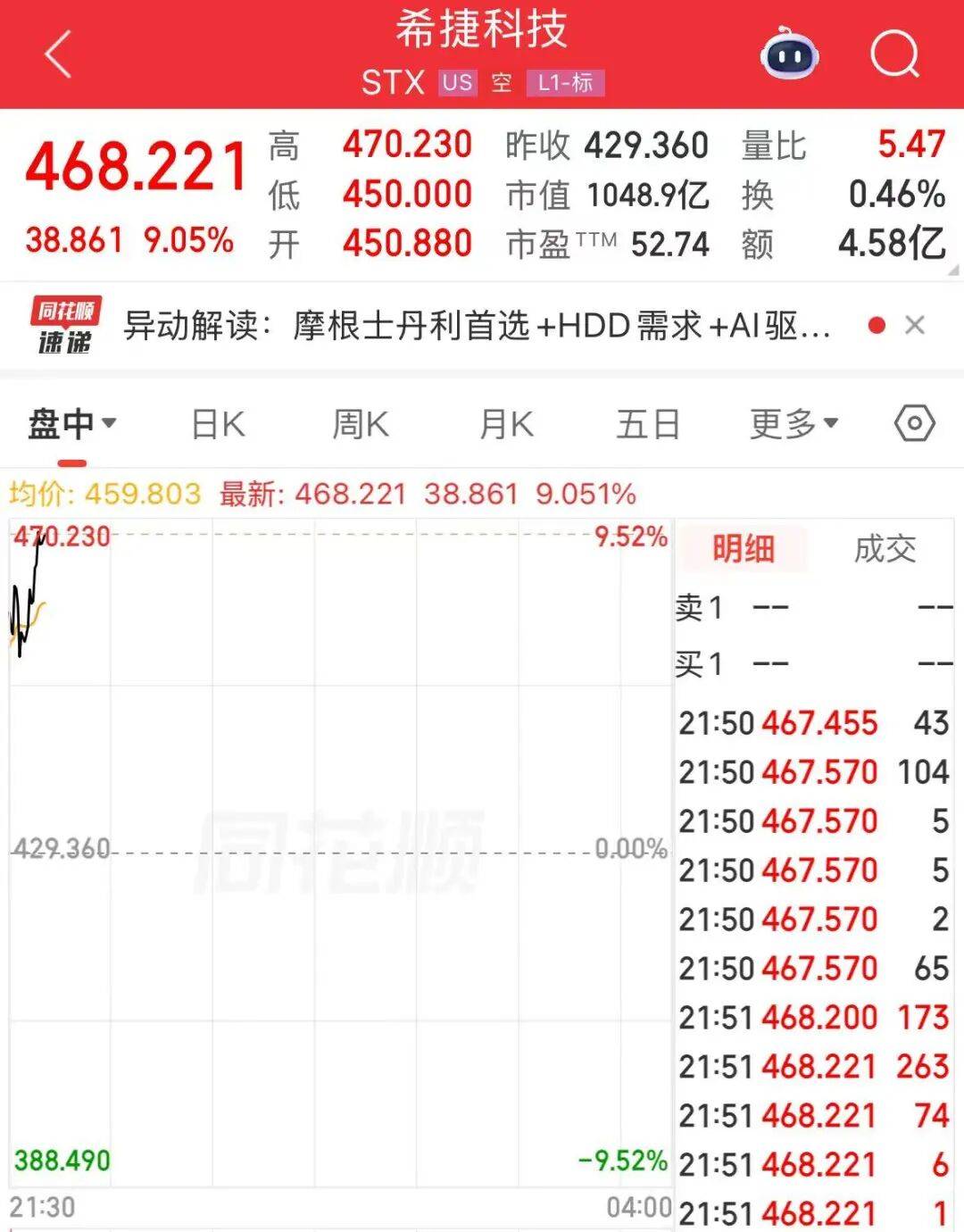 芯片存储板块普涨,截至发稿,希捷科技涨超9%,股价创历史新高,此前摩根士丹利将该股列入其首选股名单。闪迪涨超3%,美光科技涨超2%。