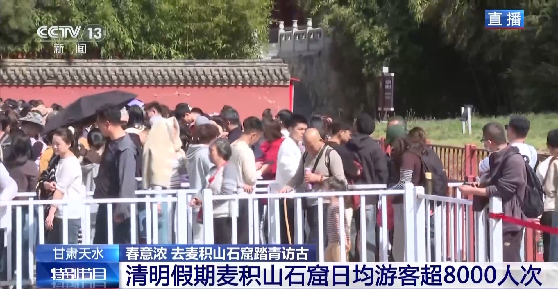 清明假期,麦积山石窟日均游客超8000人次。景区工作人员表示,往常游客进入景区的高峰期是在中午12时到14时,但在今天上午10时许,检票口就已经排起了长队。