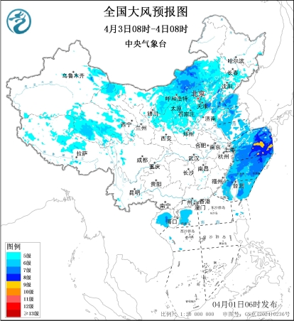 大风降温预报:4月2日至4日,西北、华北、东北地区中南部、黄淮及内蒙古中西部等地气温将下降4~6℃,局地降温8℃以上,并伴有5~6级风,阵风7~9级,其中,新疆北部、内蒙古中西部以及山西北部、河北北部和北京西部山区阵风可达10级以上;渤海、黄海、东海等海域有6~8级、阵风9~10级大风。另外,3日内蒙古东北部、黑龙江西部等地局地有大到暴雪。
