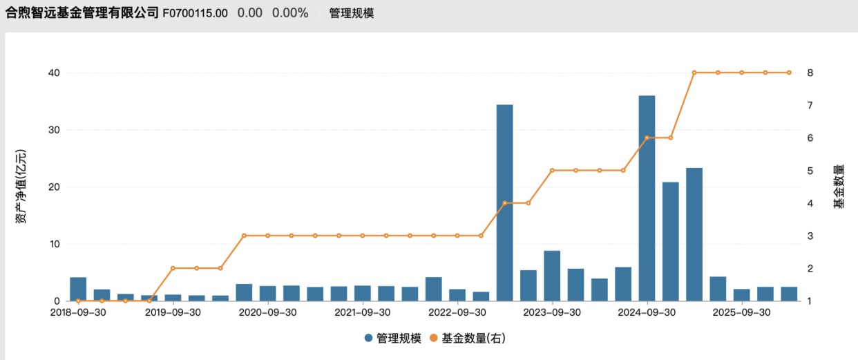 在合煦智远稳进大幅缩水后,该公司旗下另一只产品——合煦智远嘉悦利率债又扛起了规模的大旗。这只债基成立于2024年7月,成立之初的规模仅有2亿元。但在当年三季度末,合煦智远嘉悦利率债的规模激增至32.57亿元,带动合煦智远基金的整体管理规模达到近36亿元。