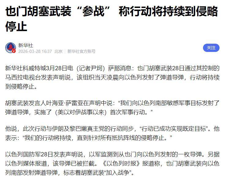 3月28日凌晨,胡塞武装通过自家电视台发布声明,声称他们已向以色列南部的军事目标发射了导弹。这不是虚张声势,而是胡塞武装首次与以色列正面交锋,毫不客气地撕开了战局的平衡。