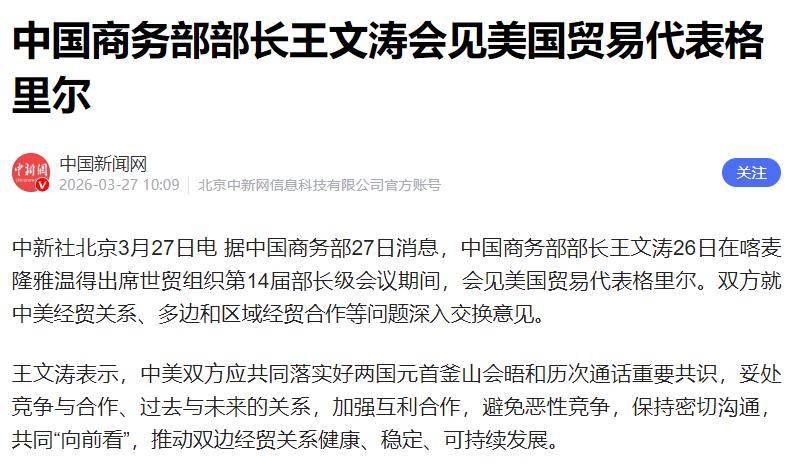 3月26日,王文涛与美国贸易代表格里尔的会晤中,中方直接开门见山,态度坚定。王文涛明确表示,中美经贸关系需要妥善处理竞争与合作的关系,避免恶性竞争,进一步加强互利合作。这一表态看似常规,但放在如今的国际背景下,实际上等于彻底堵住了将经贸问题政治化的通道。更为关键的是,中方不仅谈合作,更在会上直言不讳地框定了规则,实际上将谈判从情绪对抗转回了利益清算的轨道。语言越直白,误判的空间就越小,也能够避免对方在模糊的空间内做文章。