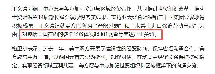 这种替别人说话的行为,并非简单的为他人出头,而是在争夺一个更为关键的东西——国际贸易的可预期性。因为一旦301调查工具被无限扩张,今天可能是中国,明天就可能是其他任何一个出口表现良好的经济体。格里尔的回应看似也很配合,同样提出了三点,表示过去一年有建设性磋商,愿以元首共识为指导加强对话,并愿在WTO及区域框架下加强沟通。虽然表态很顺畅,但中方从来不在意只是言辞,而是注重实际的行动。