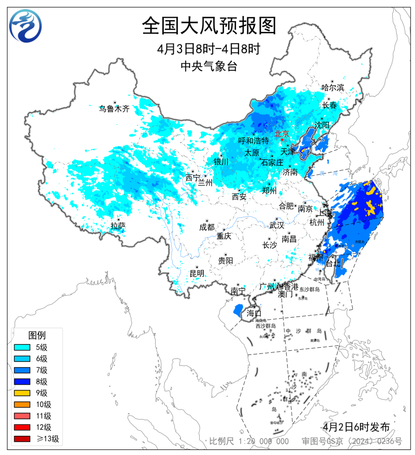 预计3日8时至4日8时,新疆东部、青海大部、西藏北部、内蒙古中西部、甘肃河西和东部、宁夏、陕西北部、山西、河北、北京、天津、山东北部、吉林、辽宁等地部分地区有4~6级风、阵风7~9级,内蒙古中部、山西北部、河北北部、北京西部等地局地阵风可达10级以上;渤海、渤海海峡、东海大部海域、台湾海峡、台湾以东洋面将有7~8级风、阵风9级,其中,渤海、东海北部、台湾海峡部分海域风力可达9级、阵风10级。